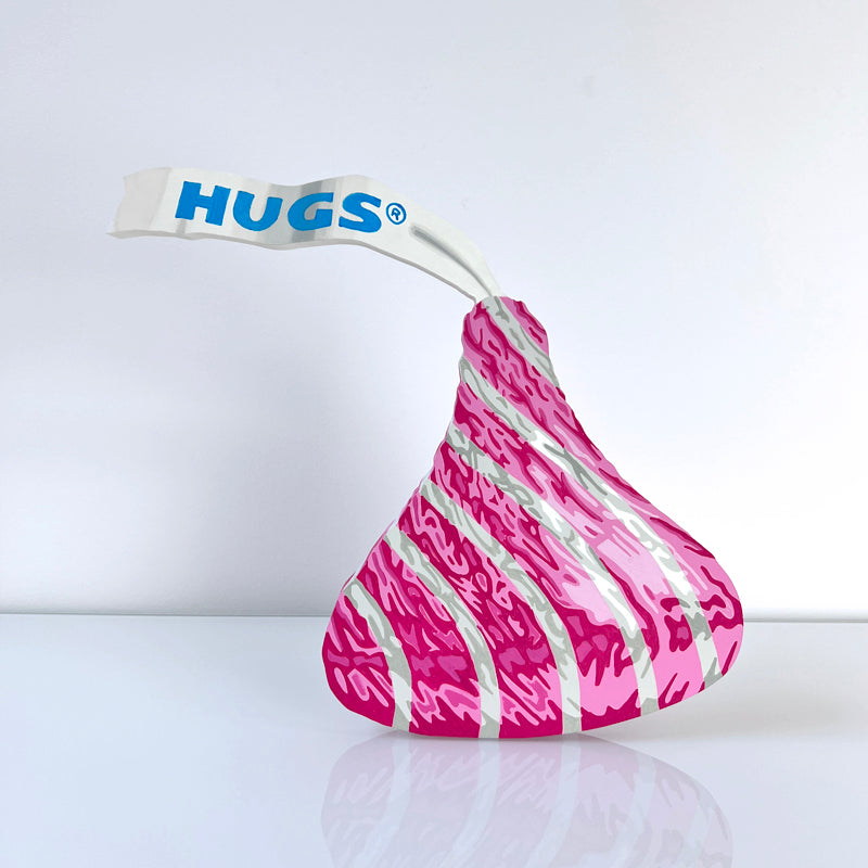 Hyperrealistic acrylic painting of a pink Hershey Hug on 3/4" cutout wood. Hanging hardware is included on the back, or it can stand upright on a table or shelf. Signed on the back by the artist.