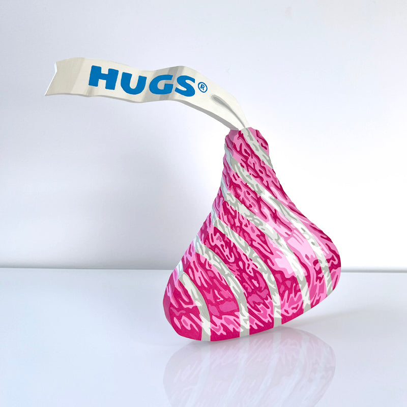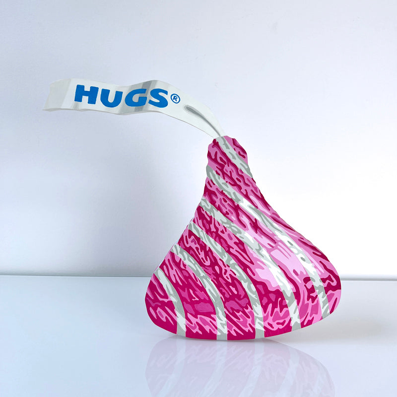 Hyperrealistic acrylic painting of a pink Hershey Hug on 3/4" cutout wood. Hanging hardware is included on the back, or it can stand upright on a table or shelf. Signed on the back by the artist.