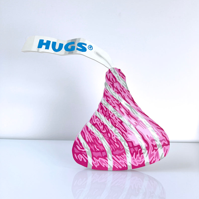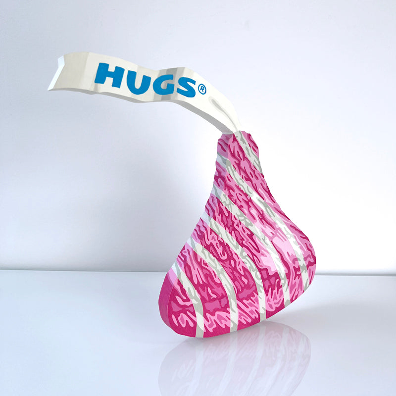 Hyperrealistic acrylic painting of a pink Hershey Hug on 3/4" cutout wood. Hanging hardware is included on the back, or it can stand upright on a table or shelf. Signed on the back by the artist.
