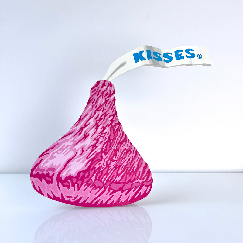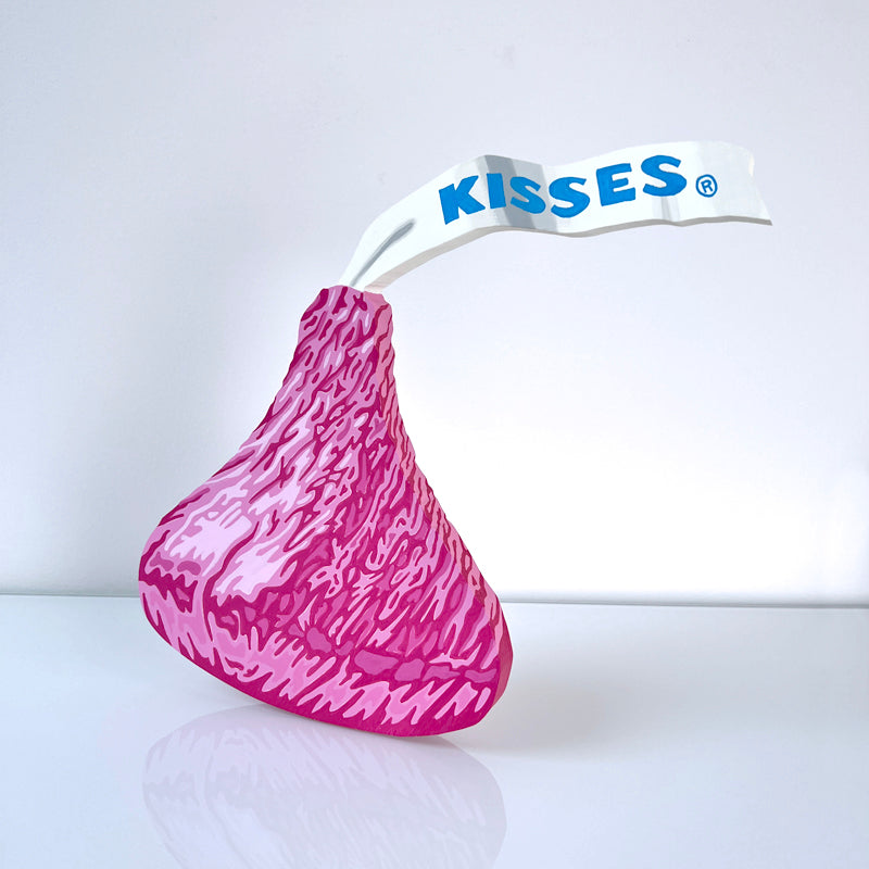 Hyperrealistic acrylic painting of a pink Hershey Kiss on 3/4" cutout wood. Hanging hardware is included on the back, or it can stand upright on a table or shelf. Signed on the back by the artist.