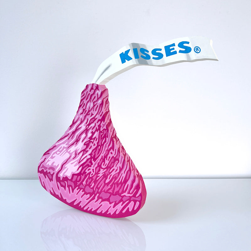Hyperrealistic acrylic painting of a pink Hershey Kiss on 3/4" cutout wood. Hanging hardware is included on the back, or it can stand upright on a table or shelf. Signed on the back by the artist.