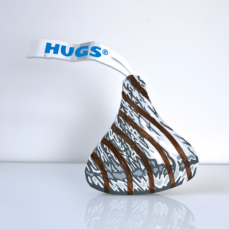 Hyperrealistic acrylic painting of a Hershey Hug on 3/4" cutout wood. Hanging hardware is included on the back, or it can stand upright on a table or shelf. Signed on the back by the artist.