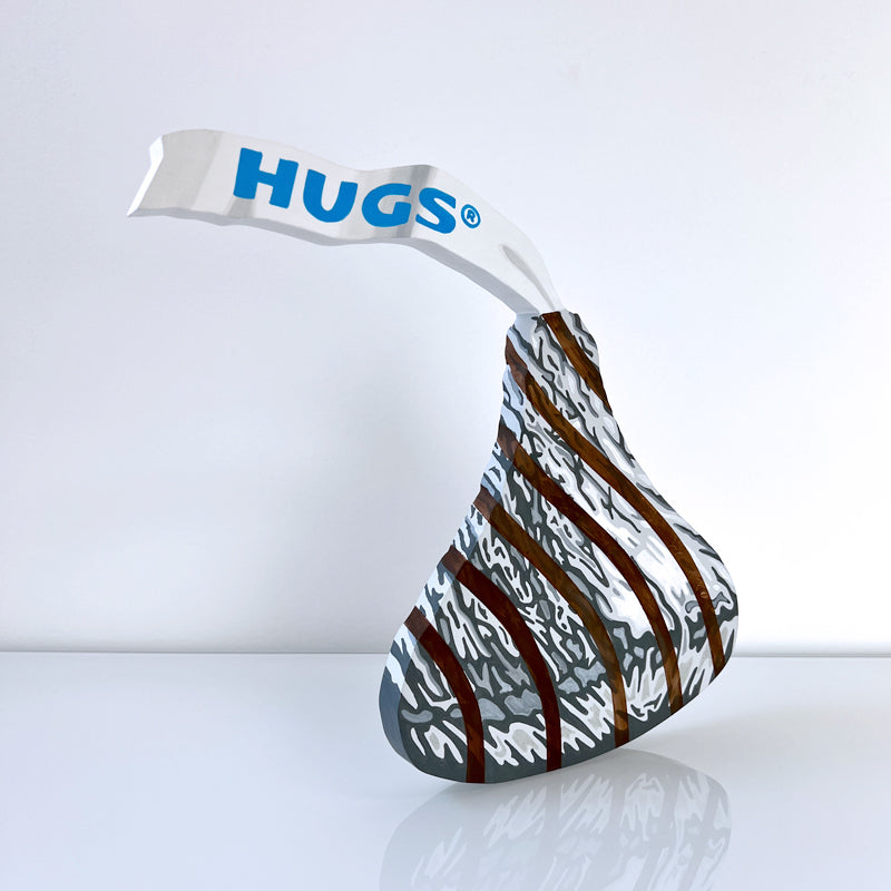 Hyperrealistic acrylic painting of a Hershey Hug on 3/4" cutout wood. Hanging hardware is included on the back, or it can stand upright on a table or shelf. Signed on the back by the artist.