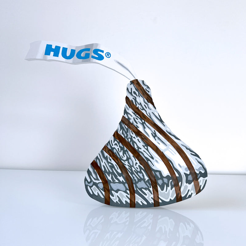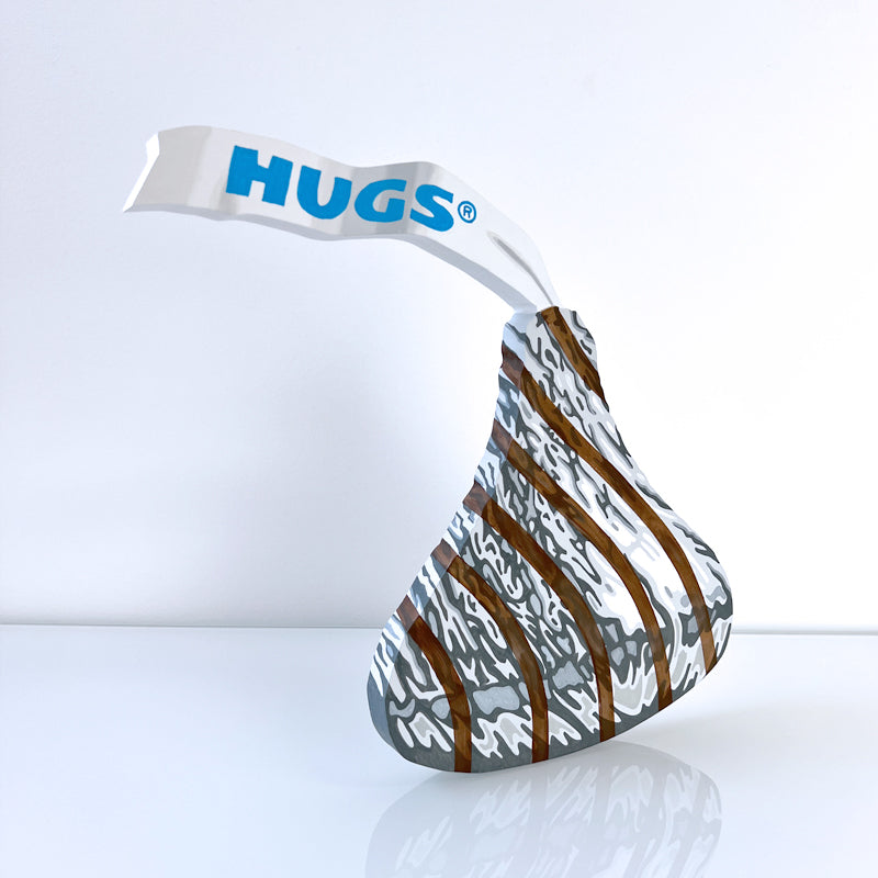 Hyperrealistic acrylic painting of a Hershey Hug on 3/4" cutout wood. Hanging hardware is included on the back, or it can stand upright on a table or shelf. Signed on the back by the artist.