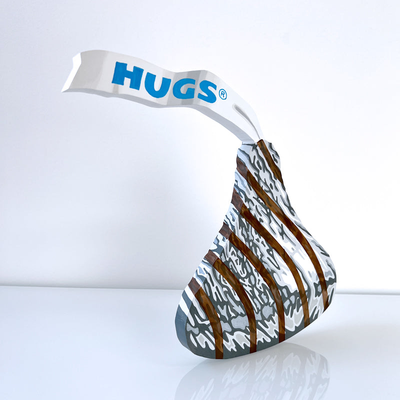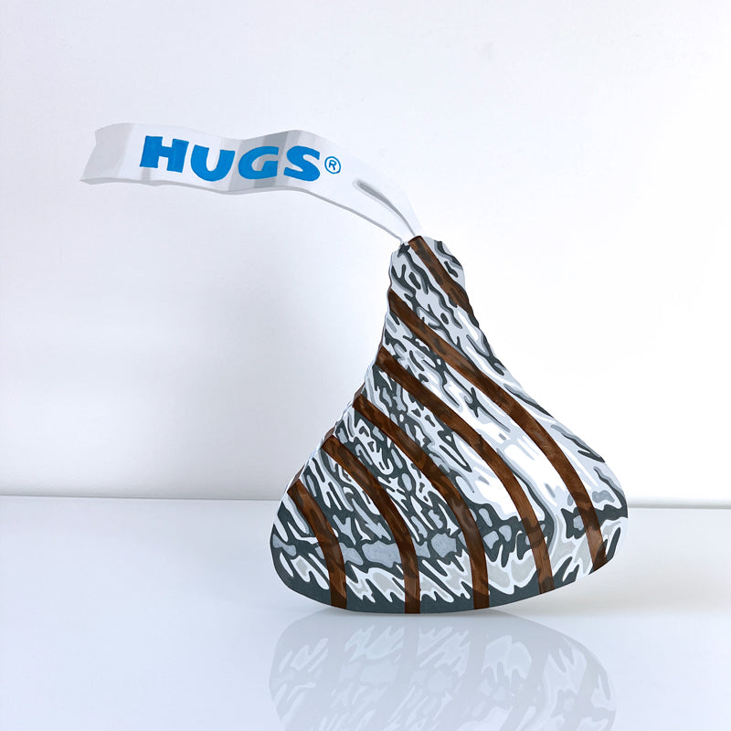 Hyperrealistic acrylic painting of a Hershey Hug on 3/4" cutout wood. Hanging hardware is included on the back, or it can stand upright on a table or shelf. Signed on the back by the artist.