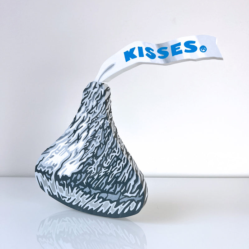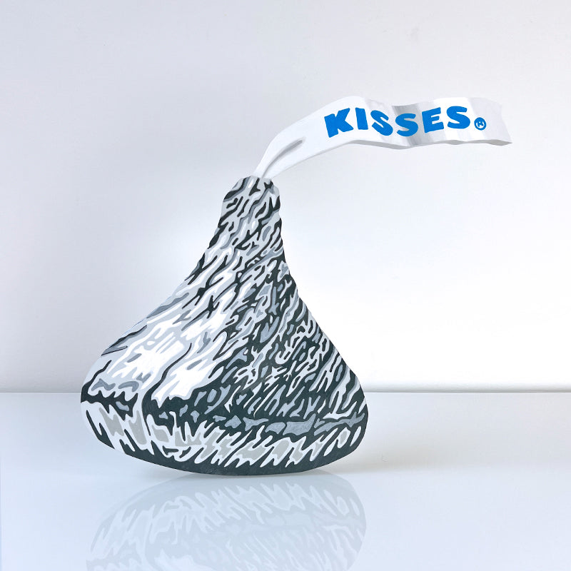 Hyperrealistic acrylic painting of a Hershey Kiss on 3/4" cutout wood. Hanging hardware is included on the back, or it can stand upright on a table or shelf. Signed on the back by the artist.