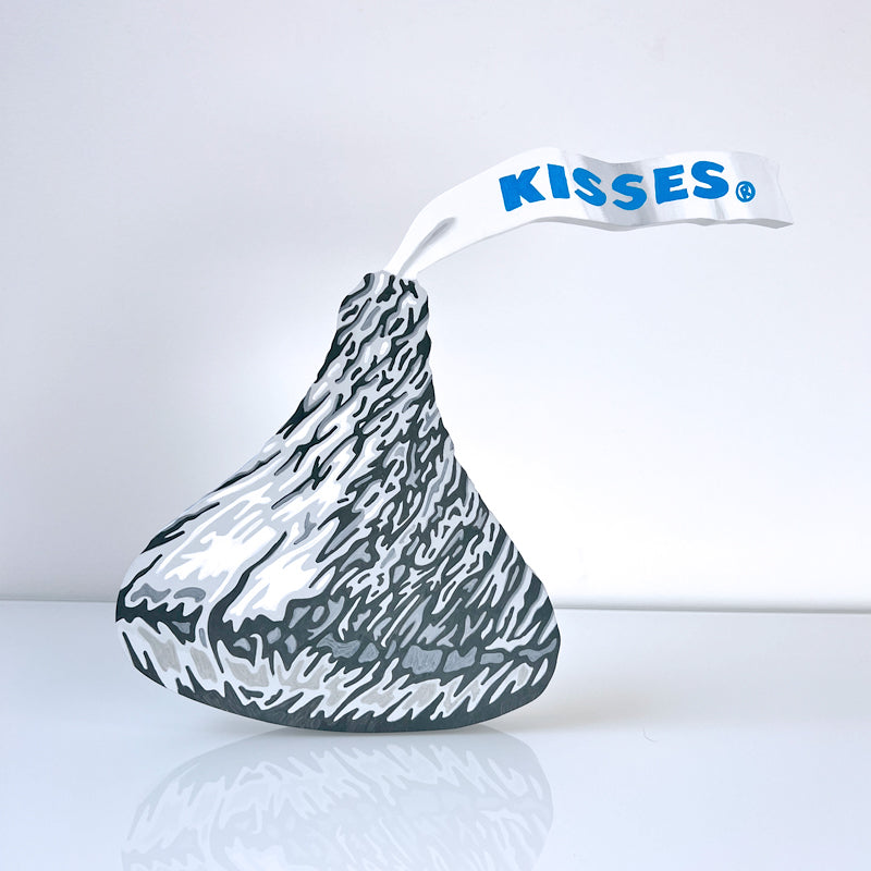 Hyperrealistic acrylic painting of a Hershey Kiss on 3/4" cutout wood. Hanging hardware is included on the back, or it can stand upright on a table or shelf. Signed on the back by the artist.