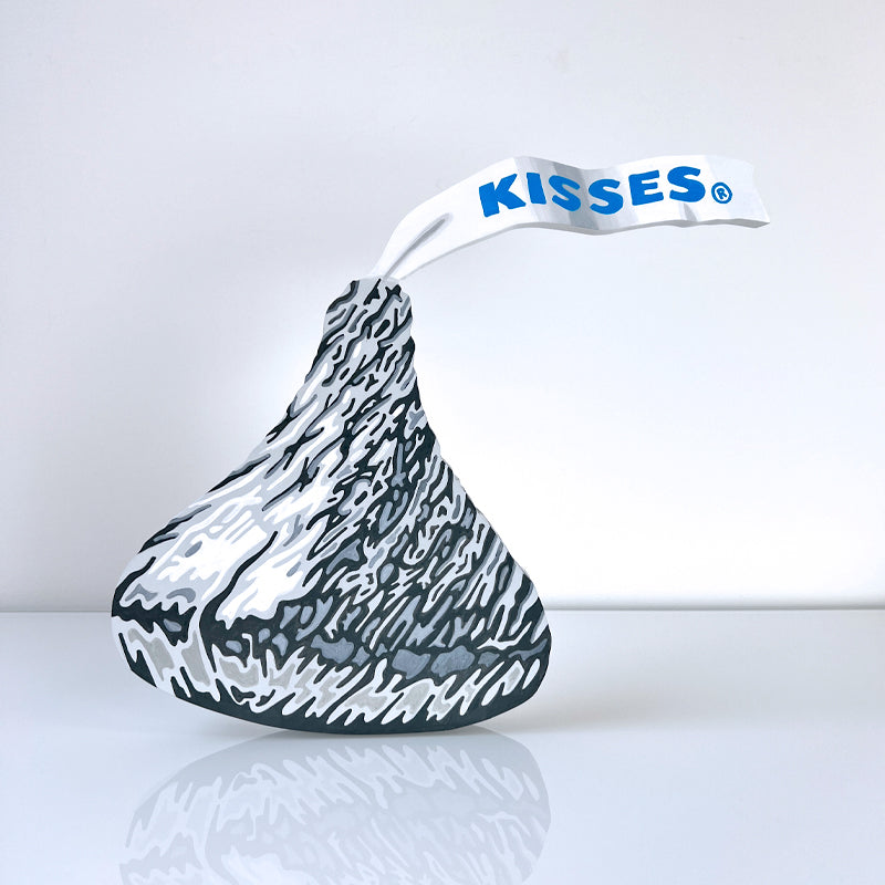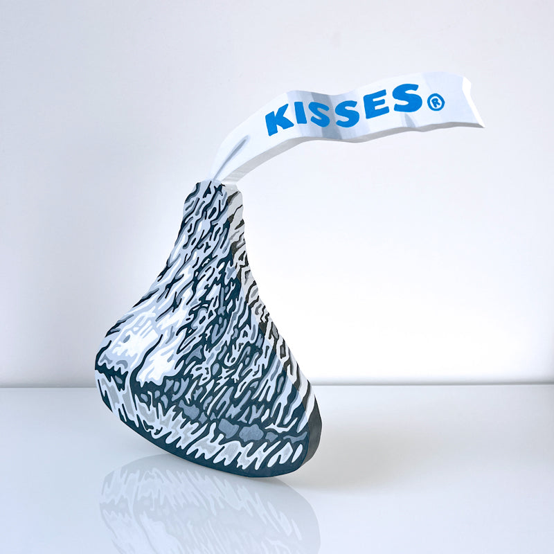 Hyperrealistic acrylic painting of a Hershey Kiss on 3/4" cutout wood. Hanging hardware is included on the back, or it can stand upright on a table or shelf. Signed on the back by the artist.