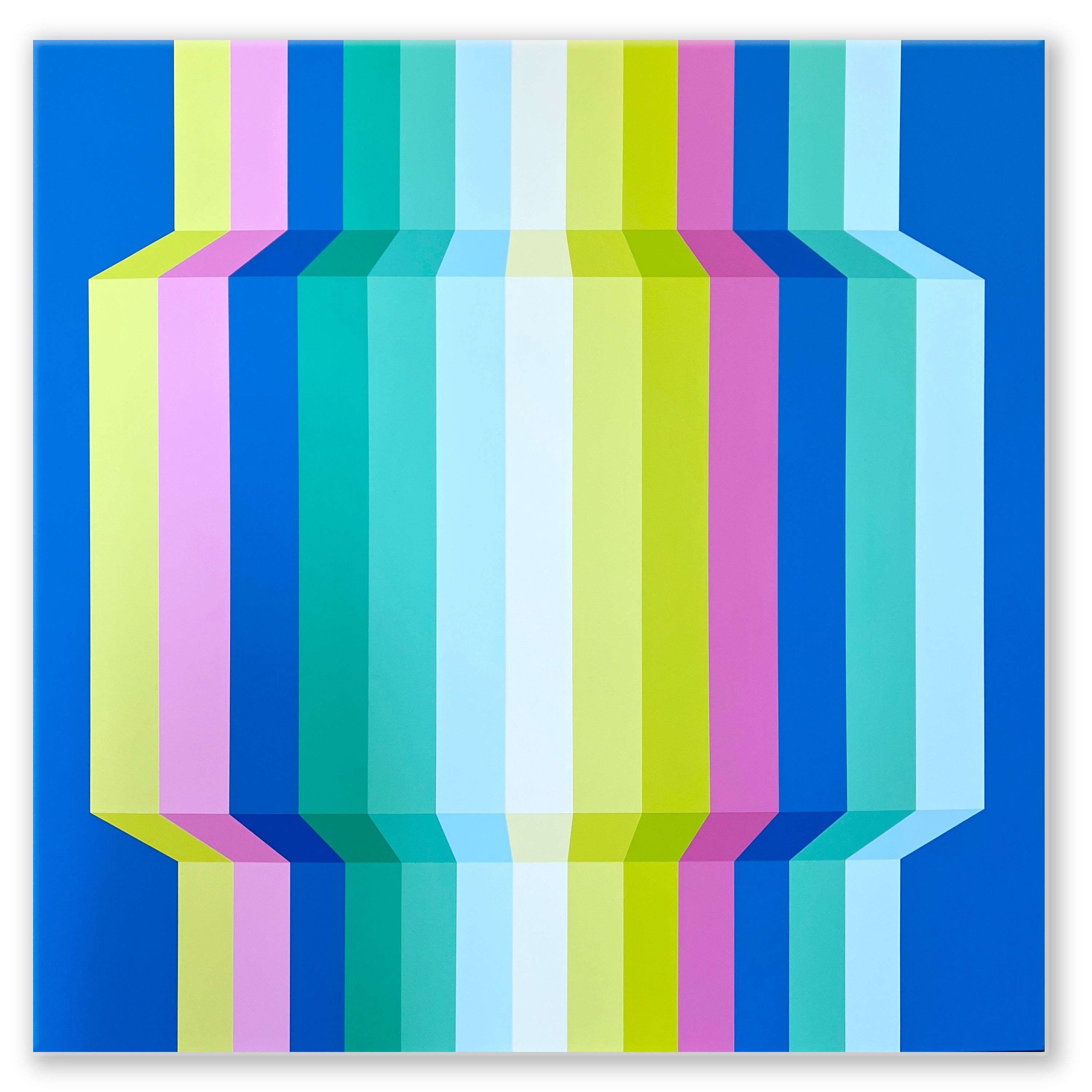 Optical art featuring a range of blues, greens, chartreuse and pinks on a blue background.