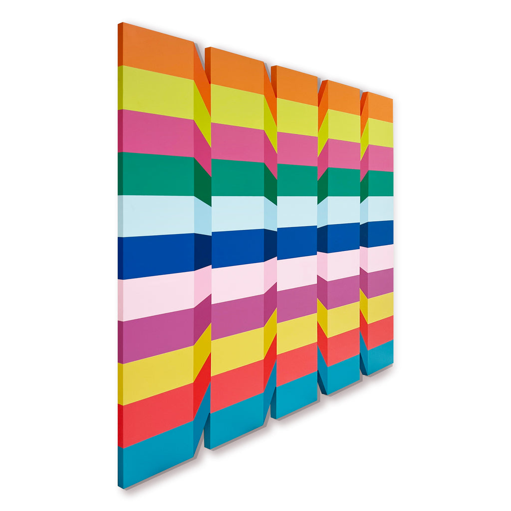Optical art featuring a range of blues, green, acid green, oranges and pinks on a 1/2" deep custom cutout wood panel.