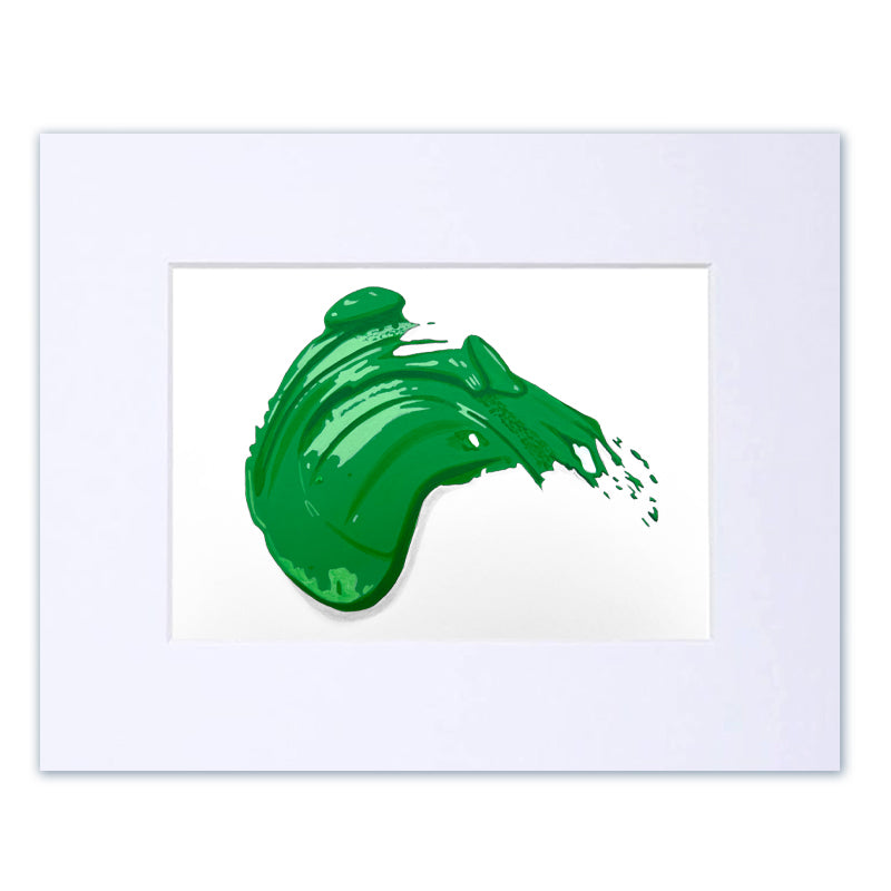 5"x7" study of a green wet paint smear. This is an original, flat acrylic painting on heavy weight vellum paper, matted with an 8"x10" white beveled mat. Signed by the artist on the back.
