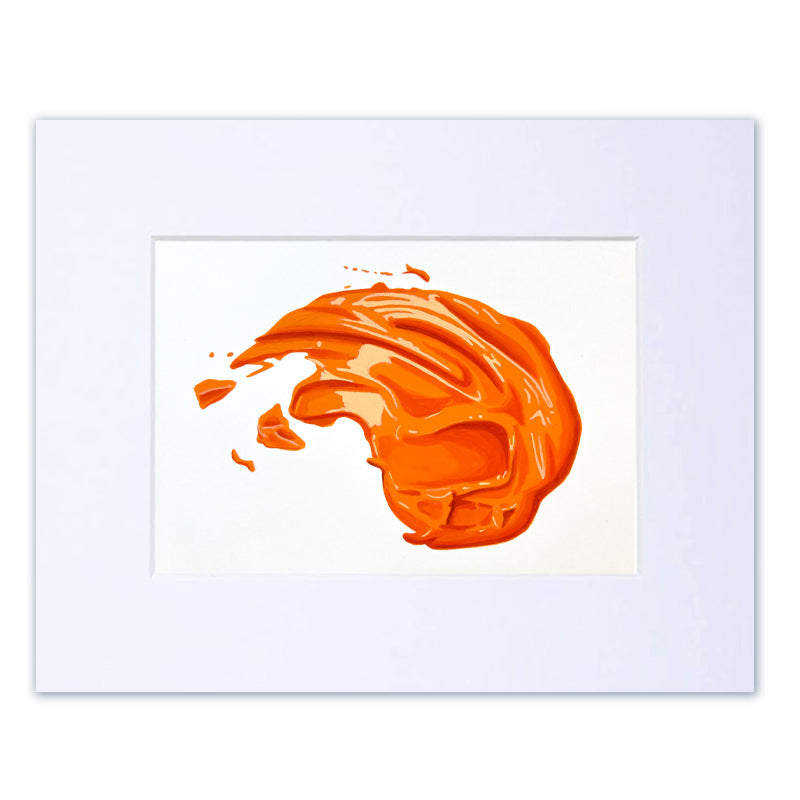5"x7" study of an orange wet paint smear. This is an original, flat acrylic painting on heavy weight vellum paper, matted with an 8"x10" white beveled mat. Signed by the artist on the back.